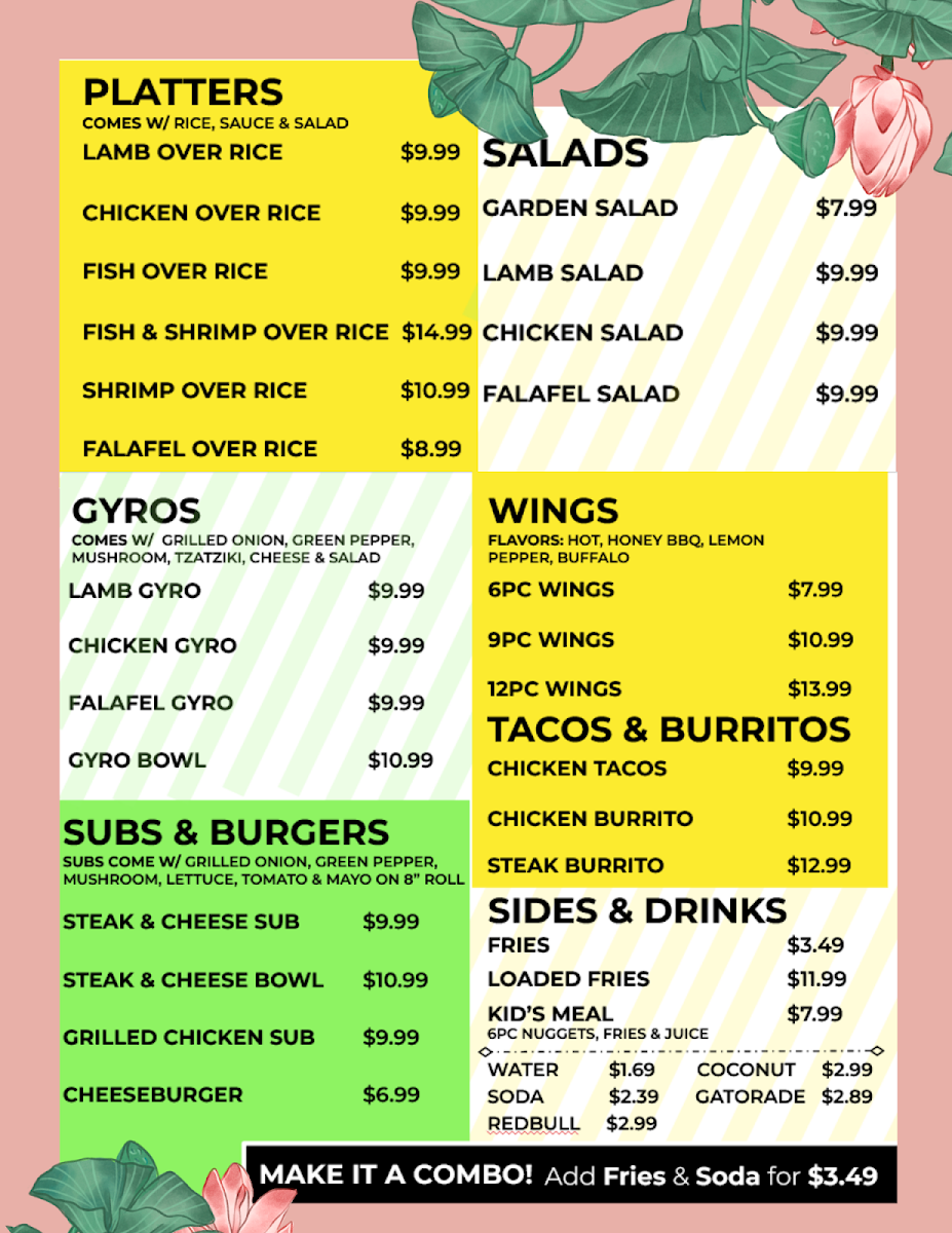 Comes with grilled onions, green peppers, mushrooms, lettuce, tomato, tzatziki sauce, cheese & white sauce